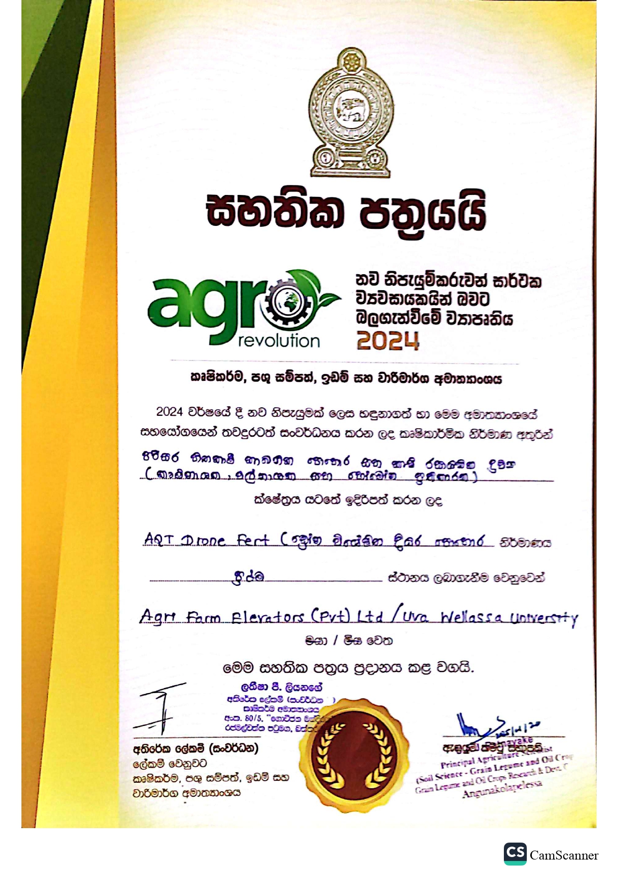 Agfel is a pioneering agriculture solutions provider committed to revolutionizing sustainable fariming through value-added products and technologies. Established in 2023, Agfel was founded with the vision of integrating innovative research outcomes into agriculture industry. Our journey began in 2015 with extensive scientific research and development, in collaboration with Uva Wellassa University and University of Ruhuna, Sri Lanka. We are proud to be the first manufacturer of drone-speciality fertilizer in Sri Lanka, leading innovation in sustainable agricultural solutions. This dedication to scientific excellence led to our award-winning hybrid liquid fertilizers, recognized as the Best Innovation Product Under the Chemical Category at South Asia's Largest Industry Exhibition (BMICH, 2024), organized by the Industrial Development Board of Sri Lanka.